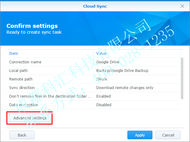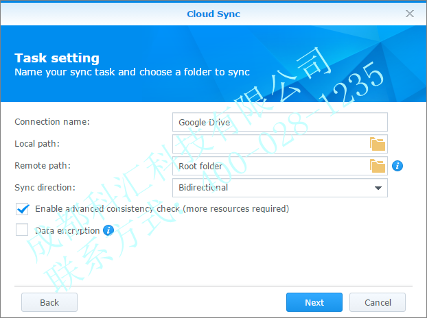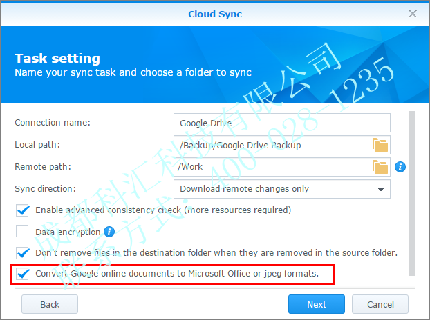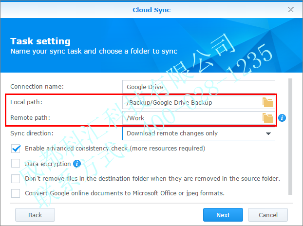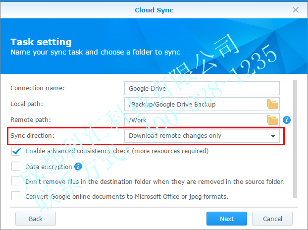 5. 现在您可设置一个同步方向。由于您正在将 Google 云端硬盘备份至 Synology NAS,请选择仅下载远程更改。