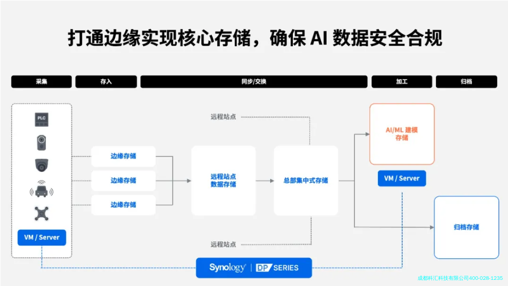 如今各行各业都聚焦在 AI 人工智能来提升业务效能,并实现数智化转型。当谈到 AI,**时间想到的是算法、算力或者模型。但其实,AI 真正的“命脉”,是数据。在国务院发布的《关于深入实施“人工智能+”行动的意见》中,明确提出要“加强数据供给创新”、“加快建设高质量数据集”,并将数据确立为推动 AI 发展的核心要素之一,而 Synology 群晖在其中就扮演着重要的角色。根据研究机构数据,超过 75% 的数据是在数据中心之外产生的——来自边缘设备、终端电脑、分支机构,以及云端应用。也就是,AI 驱动的数据正在从“集中”走向“分布”,从“可控”走向“多源”。这让企业面临一个新的挑战:如何让分散的海量数据,在安全、可管理的前提下,让企业可以高效、合规地管理Synology 群晖从三个层面,分别在边缘、终端、以及在云端,阐述 AI 驱动的数据该如何被存储、保护及应用,以解决企业边缘数据难以存储管理、数据交换不够高效、无法持续优化存储性能及降低 TCO、在满足 RTO/RPO 同时有效保护数据等难题。从边缘收集到的数据,例如:无人机影像、智驾系统数据、执法记录仪、PLC 等数据,通过边缘存储集中到远程站点后,再统一到总部机房,实现边缘数据的集中式存储及管理。而在此基础上,数据又可以进行大模型计算和语言训练等,*终通过统一备份来实现归档存储。这一流程打通边缘到核心,进一步实现 AI 大数据的全管理流程。