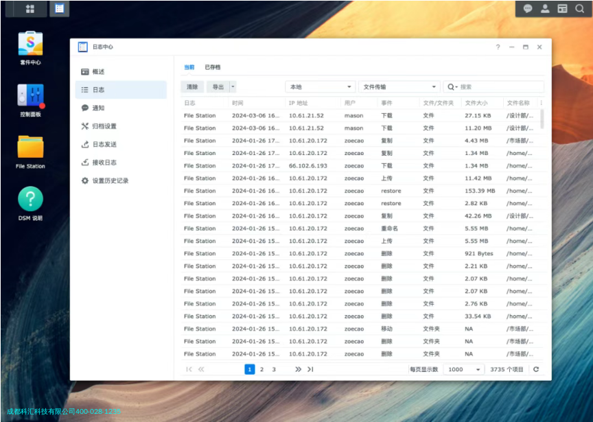 日志作为排查 NAS 问题及故障的重要工具,也是辨别它作为企业 NAS 是否专业的重要标准之一。能够详细地记录 NAS 中的帐户、文件的操作过程,在问题出现时方便追查,对于运维找“锅”是重中之重。*群晖的日志中心,支持记录并搜索增删查改等操作详情,界面简洁易懂,没有专业运维也能轻松使用。
