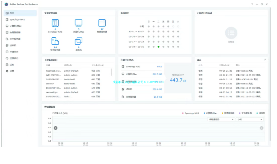 NAS 除了存储,在企业中*重要的功能就是备份了。一台能够保护电脑等生产力工具或生产环境的 NAS,对于企业来说的价值会更高。无论是开发同事的开发环境、代码工具,还是财务同事的专用软件……在电脑损坏后重装都十分繁琐,这时候能够快速还原,也为团队运营多上了一层保险。*群晖的 Active Backup for Business(ABB)支持整机备份 Windows、macOS、Linux 等主流系统,并可整机还原,覆盖企业办公环境。