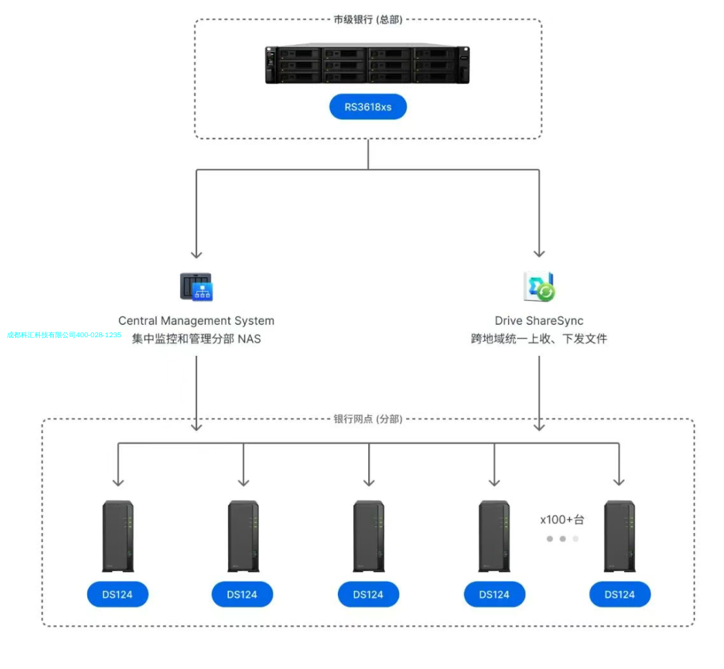 群晖五盘位 NAS 部署于全国 30+ 城市,教学资源实时同步励步英语在全国 30 多座城市拥有上百所教学中心,此前依赖公有云进行总部与分部的课件下发、同步及访问,存在数据泄露风险高、同步延迟明显、权限管控不足等问题,影响教学效率与质量。为打破数据孤岛,励步英语采用 “总部集群 + 分部节点” 架构:总部部署 2 台 DS3617xs 组成 HA 高可用集群,确保存储服务不中断;全国各分部共部署 300 台 DS1517+,通过 Synology Drive ShareSync 套件实现远程实时同步。教学课件统一存入群晖 NAS 共享文件夹,讲师电脑通过 CIFS 协议挂盘即可即时访问**课件,重构文件共享方式,实现教学效率与质量的双重提升。金融行业:100+ 台 DS124 落地潍坊农商银行,兼顾效率与合规潍坊农村商业银行需实现总部与全市百余个营业网点的文件精准下发与数据上收,同时需满足《金融数据生命周期安全规范》要求,对临时补丁等非必需数据进行定时清理。潍坊农商银行在总部架设了一台 RS3618xs,担任文件管理与下发的核心枢纽,各银行网点部署 1 台 DS124,形成一张覆盖各网点的存储网络。借助自定义自动清理脚本,在所有网点 NAS 上实现非必需数据的自动化、无遗漏定期删除,既保障了跨区域文件同步效率,又**满足金融行业安全合规要求。