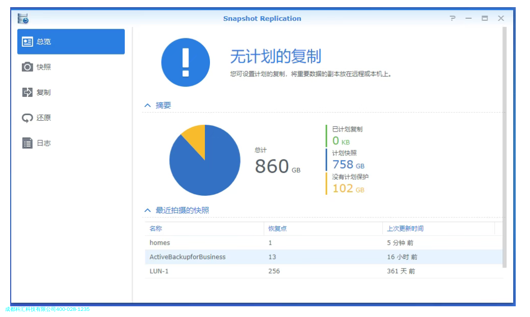 备份支持:支持备份/还原:集中备份企业服务器、虚拟机和云端数据,支持VMware虚拟机/,虚拟机/PC/服务器,并在业务系统宕机无法启动时,可以通过群晖自带的虚拟机还原业务系统,并启动虚拟机顶替业务,起到灾备作用;