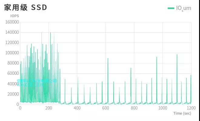 家用级 SSD 的 IOPS 性能刚开始表现**优秀,峰值可高达 140,000。虽然在初始阶段(0 - 300 秒左右的时间段)表现抢眼,但超过这个时间段之后性能就会大幅下降,宛如坐上了过山车,经历了起起落落落落...…