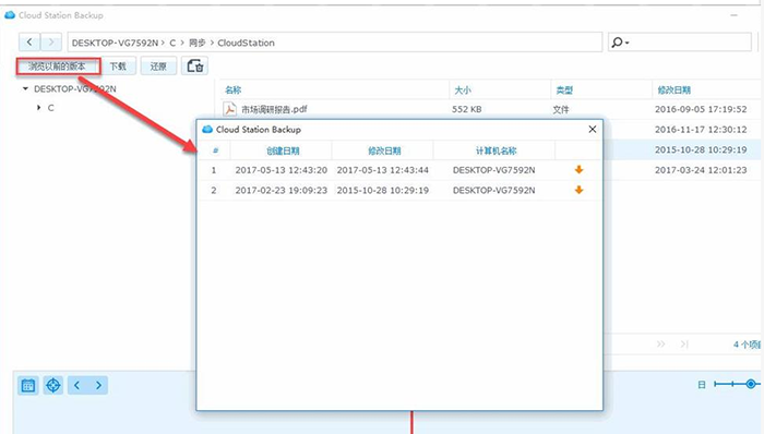群晖Cloud Station Backup电脑备份工具支持高达32个历史版本,如果电脑不幸感染勒索病毒,可以在电脑客户端选择浏览以前的版本,直接还原没有被加密的文件。