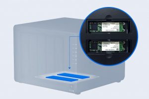DS1019+ 配备双本机 M.2 NVMe SSD 插槽,使您可以在不占用硬盘托架的情况下构建 NVMe SSD 缓存。您还可以通过一个 DX517 扩充设备扩充到多达 10 个硬盘,从而无缝扩充存储容量。