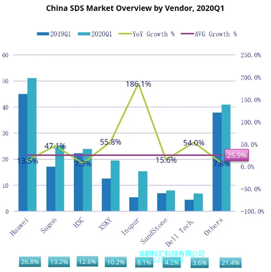 具体到厂商,SDS整体市场排名中,华为,曙光,H3C和XSKY继续保持前四排名。其中,前四厂商中,XSKY的增长率达到55.8%,两倍于整体市场增速(25.9%),XSKY的整体市占率为10.2%。