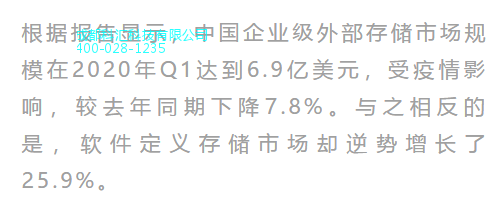 根据报告显示,中国企业级外部存储市场规模在2020年Q1达到6.9亿美元,受疫情影响,较去年同期下降7.8%。与之相反的是,软件定义存储市场却逆势增长了25.9%。