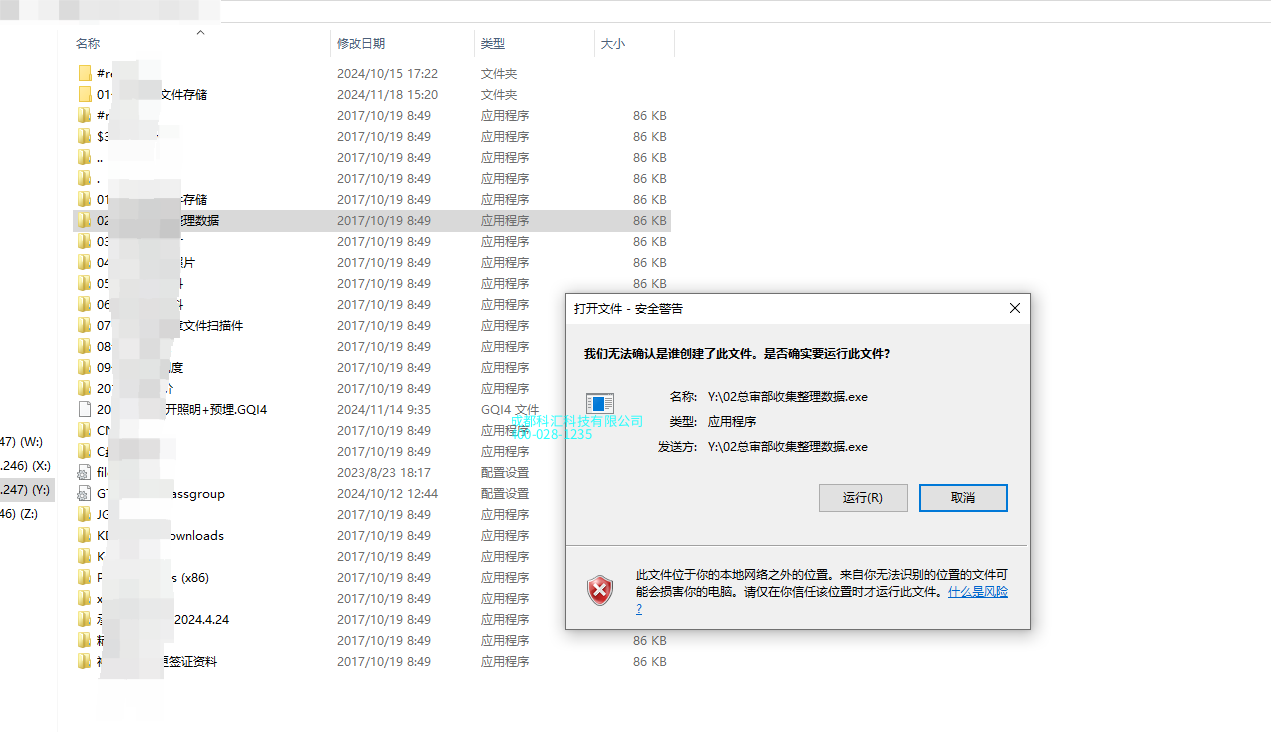近期,我们有一位客户在打开nas上存储的文件夹时出现了弹出安全警告,仔细观察这文件夹类型,可以看出显示的是应用程序,即后缀为“exe”,而且大小全是“86KB”,很显然是原文件被替换为了病毒文件,并完成了伪装。这是典型的中了蠕虫病毒的现象。