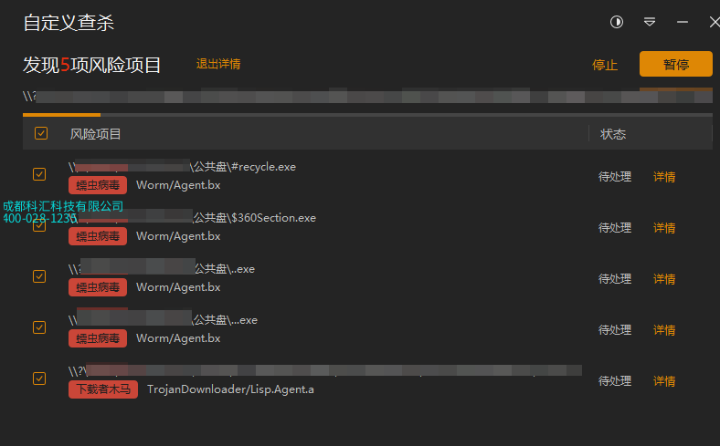 后来让客户使用火绒安全软件的自定义查杀功能,扫描磁盘映射出来的带毒的文件夹,进行病毒查杀,自动处理即可。