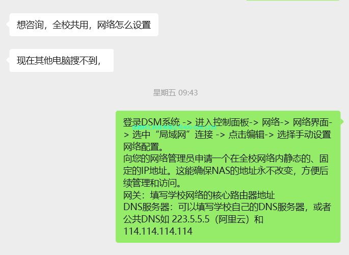 校方技术人员发来求助:“想咨询,全校共用,网络怎么设置?现在其他电脑搜不到”。群晖的技术支持团队立即响应,通过专业的远程指导,开始了问题排查与解决。