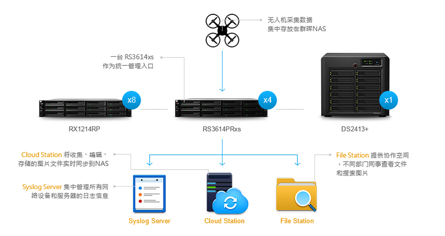 在测试完成后,该院决定大规模导入群晖 NAS 作为全新的数据存储中心,用 4 台性能强大 RS3614RPxs 群晖企业级 NAS 作为多设备、多账户管理系统,加上 8 台群晖 NAS RX1214RP 和原有的 1 台 DS2413+ 做数据存储和文件备份,以其中 1 台 RS3614RPxs 作为入口统一管理其他 NAS,形成了一套集中存储、备份、数据共享的完整解决方案。下面看这套全新的办公平台是如何在设计院运作的。