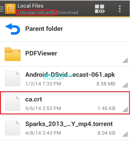 2. 使用 DS file 或 ES File Explorer(一款第三方应用程序),并将 .crt 文件复制到 SD 卡的根目录。