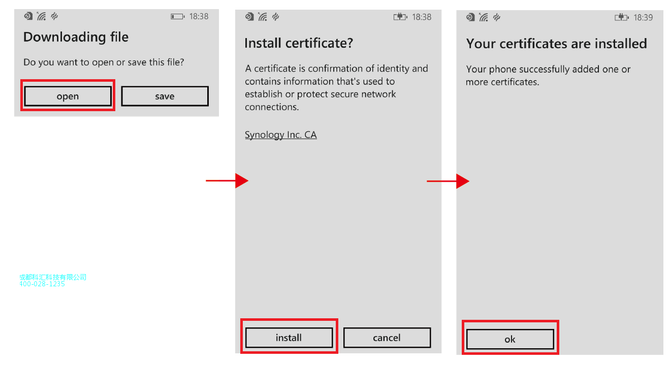 为防止网络攻击或信息漏洞,我们建议您在使用移动设备访问 Synology NAS 上的文件时将自我签署证书导入到移动设备。开始前,您应已创建了来自 Synology NAS 的证书文件。若要了解如何创建创建证书,请参见此文。