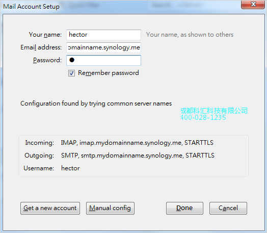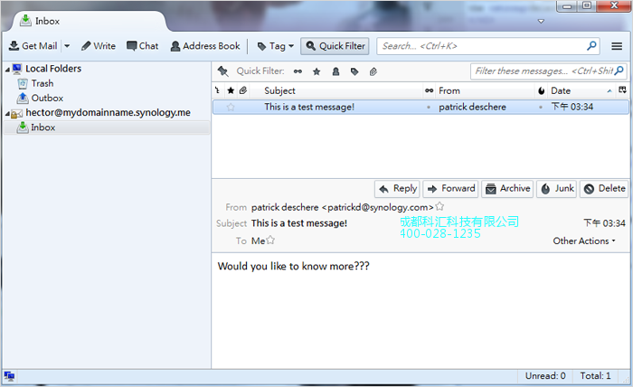Synology NAS 上的电子邮件帐户可与不同的邮件客户端链接,如 Microsoft® Outlook® 或 Mozilla® Thunderbird™。在下例中,我们将介绍如何使用 Thunderbird 来访问 Synology NAS 上的电子邮件帐户。