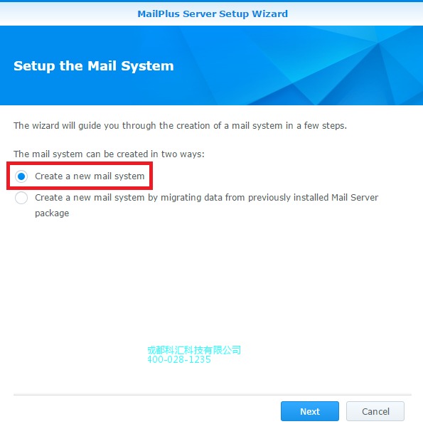 1. 启动 MailPlus Server,如果您要设置一个全新的邮件系统,请选择创建新邮件系统,并单击下一步以继续设置。或者,您可选择通过从之前安装的 Mail Server 套件中移转数据以创建邮件系统。在此检查有关如何将 Mail Server 移转到 MailPlus Server 的信息。