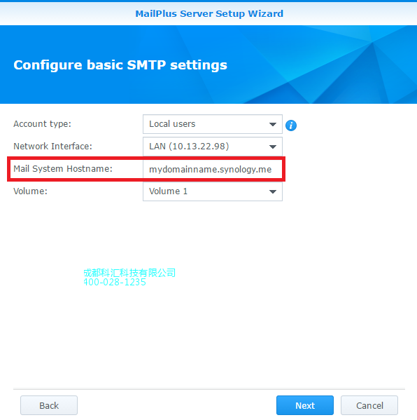 2. 在“邮件系统主机名”栏中输入您已注册的域名。此域名将出现在用户电子邮件地址中的 @ 之后。例如,如果在此输入“mydomainname.com”,则用户的电子邮件地址将为“username@mydomainname.com”。