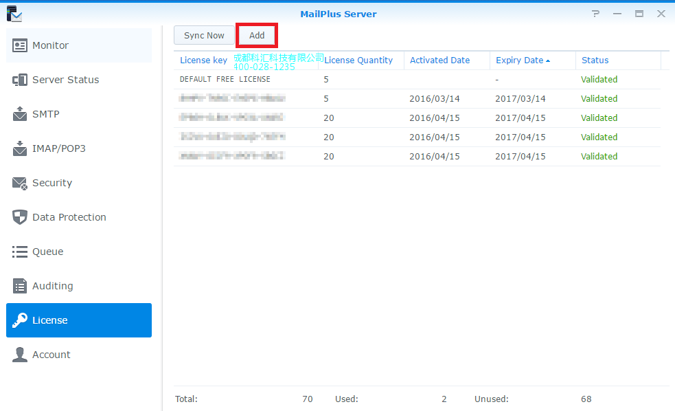 6. MailPlus Server 安装时默认带 5 个免费的电子邮件帐户,如果您需激活更多的电子邮件帐户,可在许可证页面中添加更多的许可证。