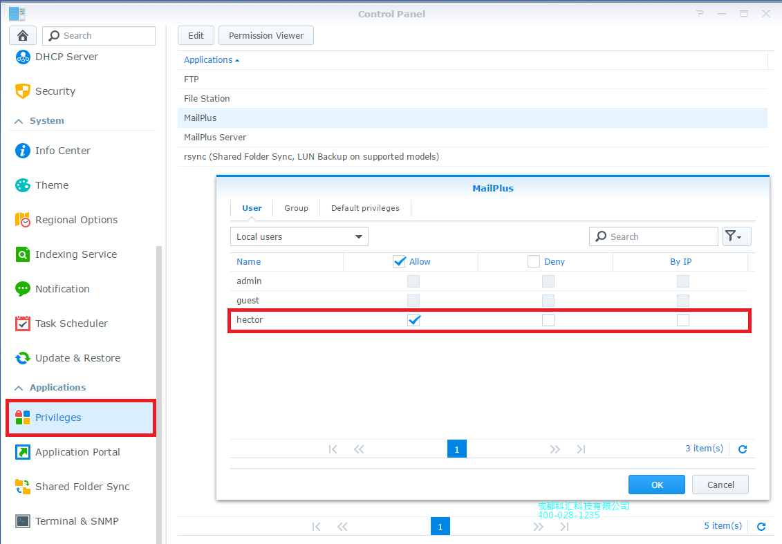 2. 进入控制面板 > 权限,允许您的帐户访问 MailPlus。
