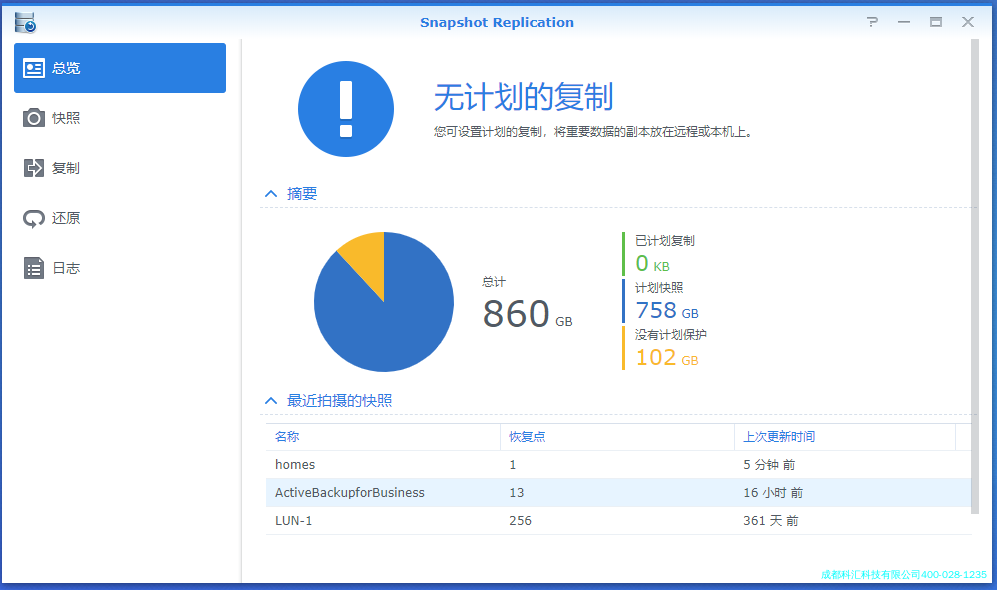 备份支持:支持备份/还原:集中备份企业服务器、虚拟机和云端数据,支持VMware虚拟机/,虚拟机/PC/服务器,并在业务系统宕机无法启动时,可以通过群晖自带的虚拟机还原业务系统,并启动虚拟机顶替业务,起到灾备作用;