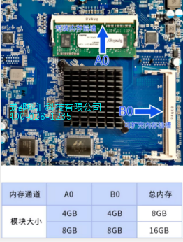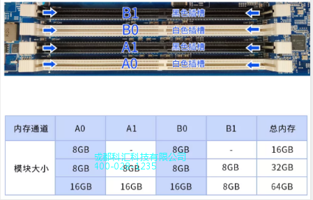 根据所属类别下的图示,在对应的内存插槽中,配置与示例表格中容量一致的兼容内存模块。注意,在配置内存后,启动设备前,请确认A0插槽已填充,否则将无法开机。