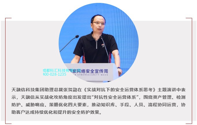 优秀应用案例”,天融信科技集团助理总裁张贺勋受邀出席并发表主题演讲,就对抗性安全运营体系的应
