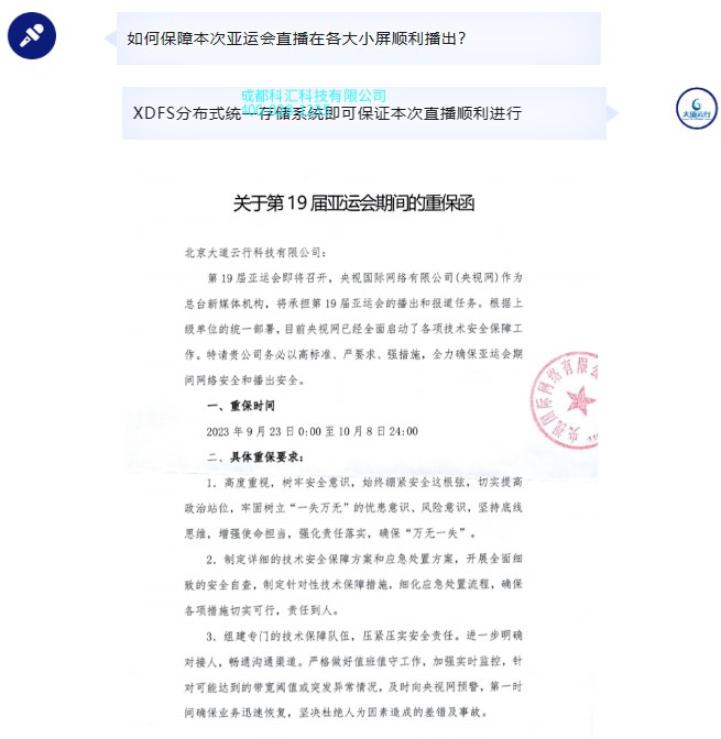 在杭州亚运会上得到应用,近年来的春晚、两会、中秋晚会等大型直播活动,均由XDFS保驾护航。