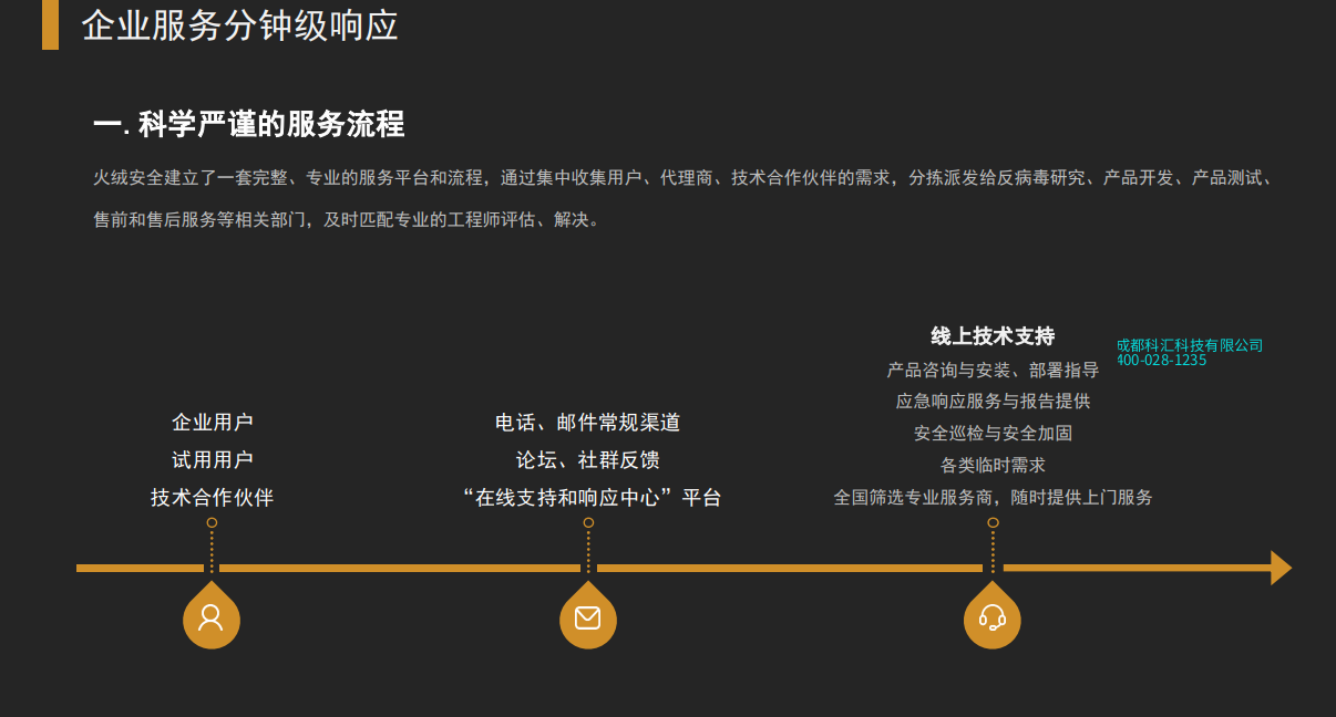 火绒建立一套完整的、专业的服务平台和流程,通过集中统一收纳用户、代理商、技术合作伙伴等企业需求,分拣派发给反病毒研究、产品开发、产品测试、售前和售后服务等相关部门,及时匹配专业的工程师评估、解决。