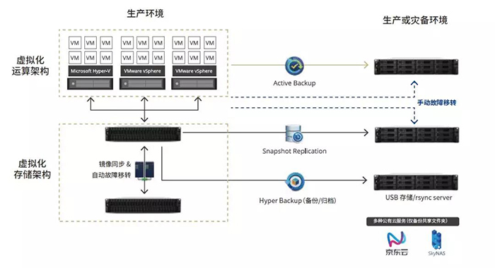 并且内置多重数据保护方案,享有快照复写、高可用性以及 VM 与存储层级的备份,可以将数据备份到多重目的地,包括:异地远程 NAS 、外接存储设备、或云端服务,进一步保障生产环境的数据安全。