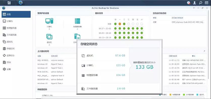 群晖 Active Backup for Business(以下简称“ABB”)无需额外许可证费用,可以实现多平台备份一体机,支持 PC、服务器、虚拟机的整机备份和还原。借助增量备份,和异动区块追求技术 (CBT) 可以有效节省备份时间。内置的全局重复数据删除可以实现跨设备、跨平台和跨版本的重复数据删除,有效精省 47% 的存储空间。*中铁六院实测