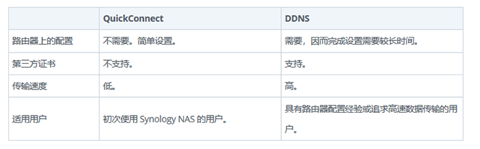 DDNS和QuickConnect两种方法具有相似的功能,但是本质上在网络连接过程方面有所不同。QuickConnect 允许设备通过 Synology 服务器与 DSM 建立间接连接,而 DDNS 可帮助与 DSM 建立直接连接。那么两者之间的区别在哪里呢?看下图: