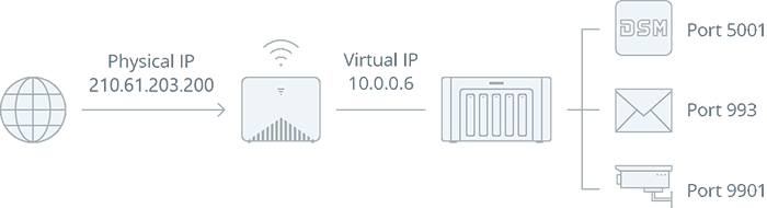 设置端口转发规则后,您可以通过连接了不同端口号的同一公共 IP 地址访问这两个 Synology NAS 托管的网站服务: