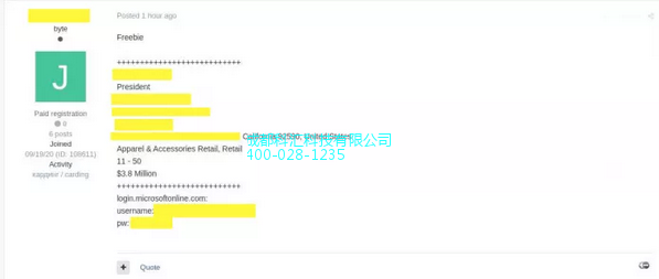 据报道,黑客正在出售全球数百家公司高管的电子邮件账户密码。具体来说,该黑客正在出售**管理人员的 Office 365 和微软账户的电子邮件和密码组合,这些高管包括各公司的 CEO、CFO、总裁和副总裁。据悉,这些数据正在一个名为Exploit.in的黑客封闭式地下论坛上出售。相关人员表示,这些被泄露的电子邮件可能被用于CEO诈骗或商业电子邮件攻击(BEC)诈骗。为了防止黑客将**类型的窃取凭证货币化,*简单方法是使用两步验证(2SV)或双因素认证(2FA)。