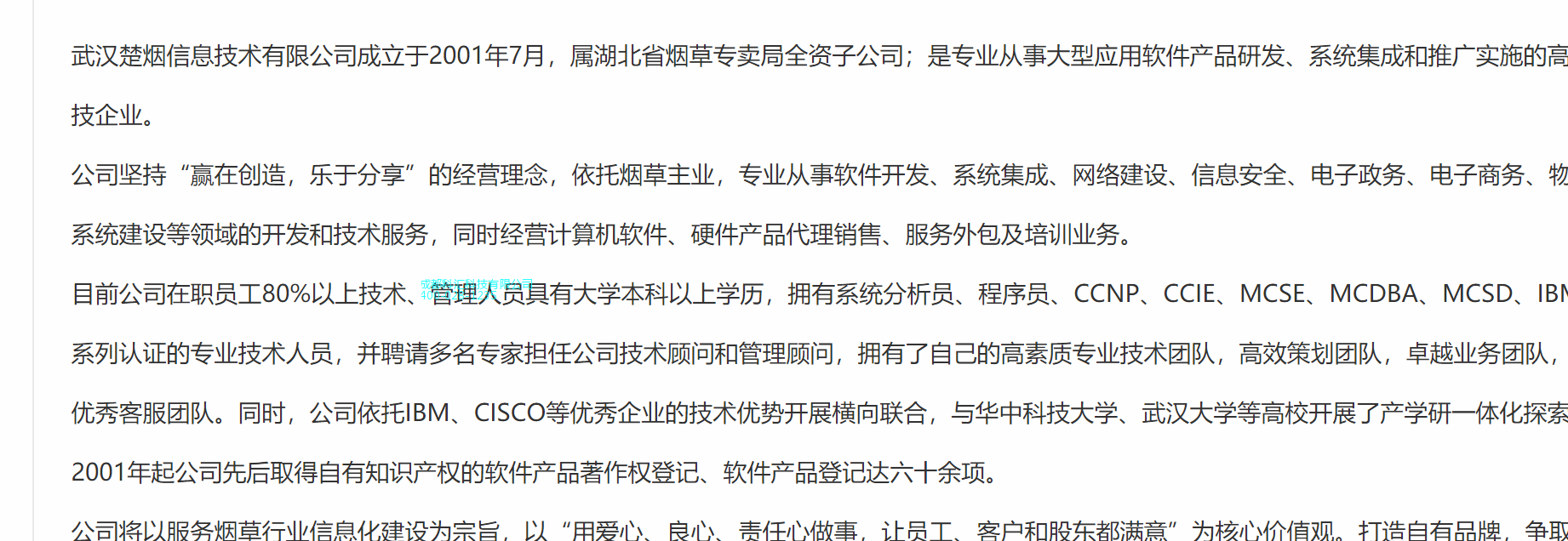 武汉楚烟信息技术有限公司成立于2001年7月,属湖北省烟草专卖局全资子公司;是专业从事大型应用软件产品研发、系统集成和推广实施的高科技企业。