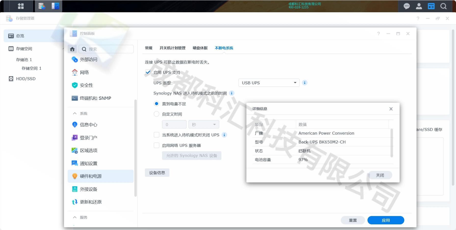 在安全层面的考虑上,为防止突然断电而可能导致设备受损、硬盘损毁和数据丢失,客户自己提供了UPS,接入到NAS,DS1621+支持多种UPS类型,支持多样式自动关机,满足不同场景。