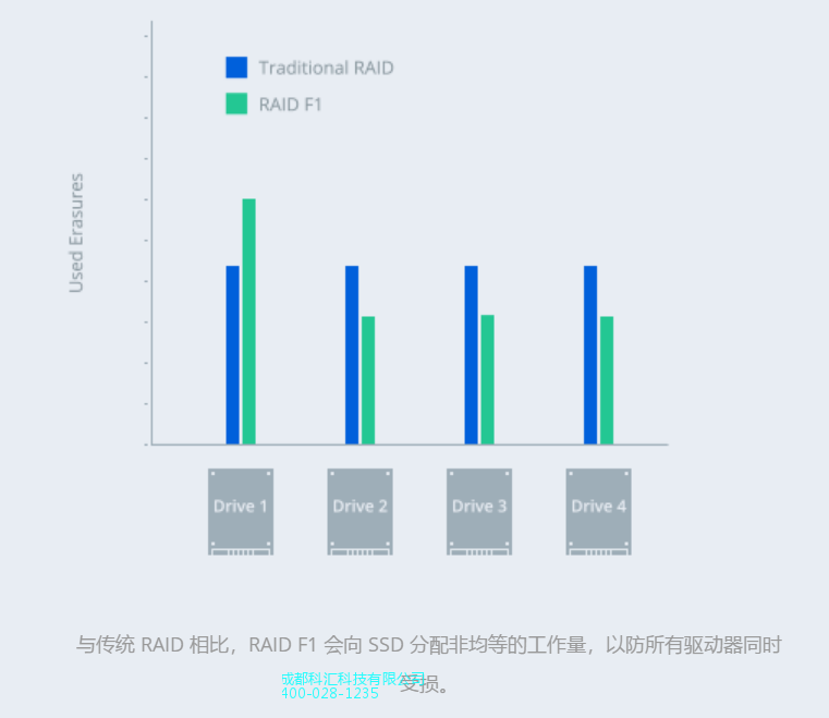 由于 SSD 和 RAID 技术的特殊性,当前所面临的一项共同挑战就是如何防止所有驱动器因负载均匀分配而同时出现故障。RAID F1 利用专门设计的算法将负载以非均衡的方式分配到驱动器,缓解了这一问题,这既提高了存储池的存储能力,又确保了数据的安全。
