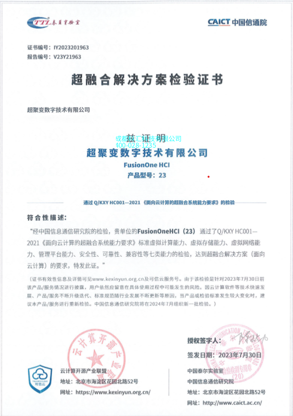 超聚变FusionOne HCI超融合解决方案成功通过《面向云计算的超融合系统要求》能力检