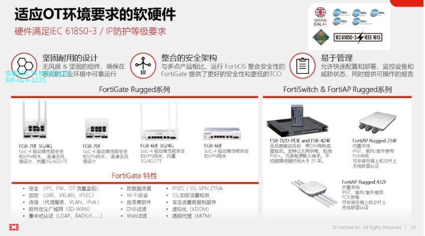全新OT专用产品包括FortiGate 70F Rugged系列下一代防火墙(NGFW),采用紧凑型设计,在单一处理器中全面融合网络和安全功能,是Fortinet 专为OT恶劣环境