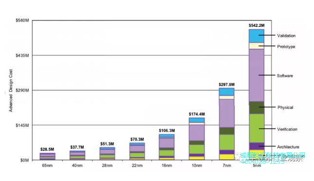 图1.不同工艺节点下的芯片设计和制造成本:数据源自IBS