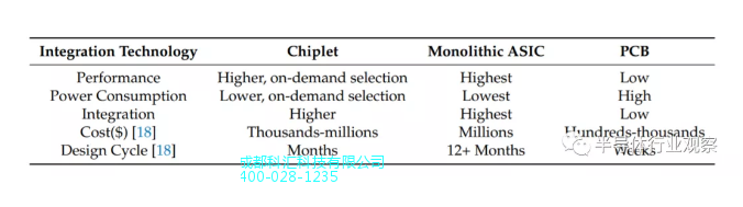 表1对比了chiplet技术与传统技术。具体而言,chiplet在性能,功耗和集成方面**接近单个ASIC芯片。而在成本和设计周期方面,chiplet与传统PCB技术之间差距很小。总而言之,chiplet在单个ASIC和PCB技术之间取得了很好的折衷,因此具有很大的发展**。