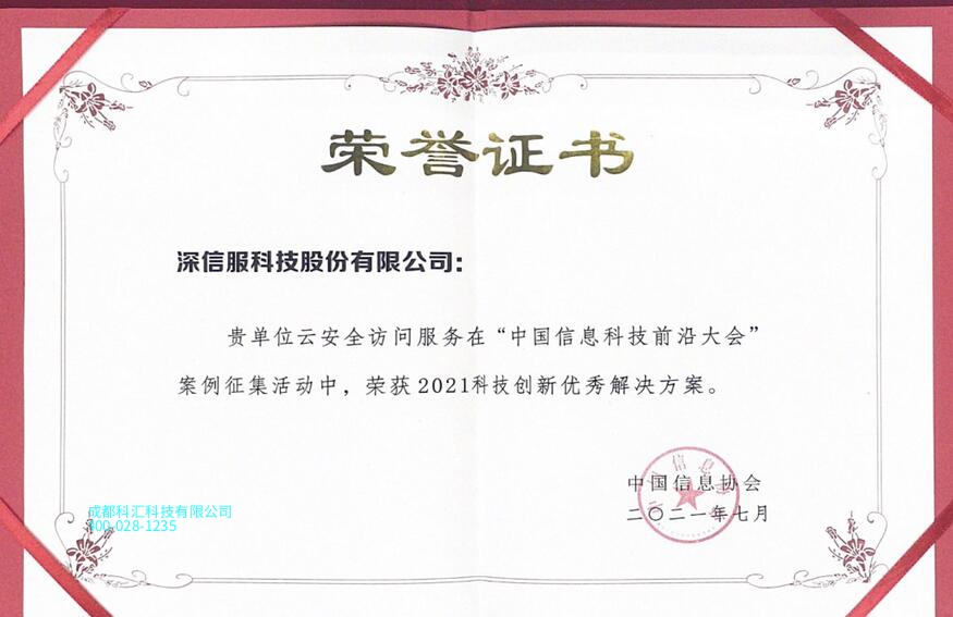 2021年7月,由中国信息协会主办的“2021中国信息科技前沿大会”在北京召开,深信服受邀参与并发表主题演讲,与知名院士、政府代表、企业代表、专家学者等就新一代信息技术重点领域及关键前沿领域的新技术、新成果、新突破进行深入探讨与交流。会上,“中国信息科技前沿大会”优秀案例征集名单公布,深信服SASE服务(云安全访问服务Sangfor Access)荣获2021科技创新优秀解决方案奖项。
