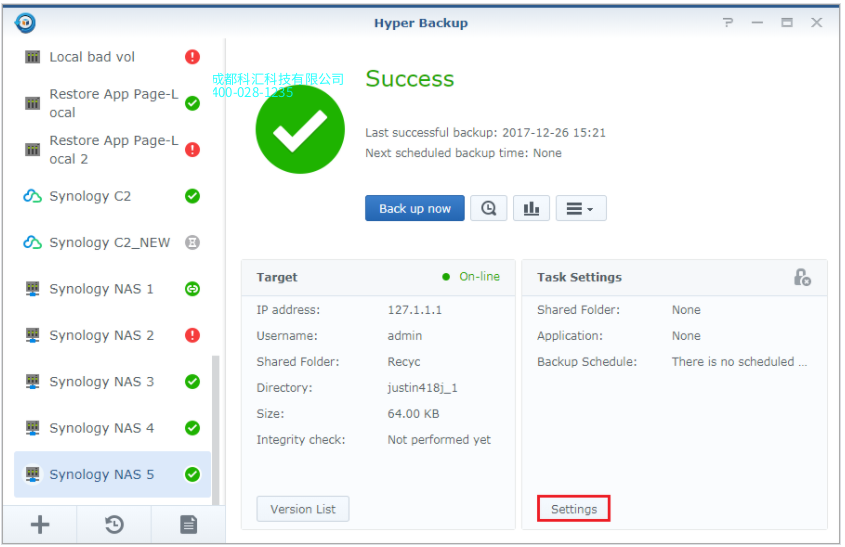 如果备份任务成功,则系统会在界面上显示绿色勾选图标。您始终可以通过单击页面右下角的设置按钮来修改备份设置。
