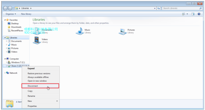 以鼠标右键点按网络硬盘,并选择断开连接。对所有网络硬盘重复相同的过程。