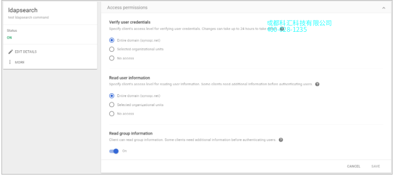 按照此Google帮助页面中的说明可了解如何配置访问权限。作为此教程的示例,我们将验证用户凭据和读取用户信息权限级别都设置为整个域(syno.net) ,然后为Synology NAS的读取群组信息切换为开。