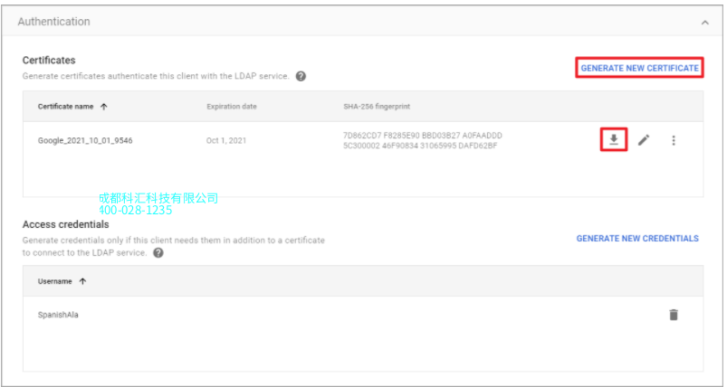 配置客户端访问权限之后,需要生成证书并将其导入到Synology NAS。单击生成新证书按钮以生成证书,该证书将用于验证Google LDAP服务与Synology NAS之间的连接。您必须下载此证书并将其上传到Synology NAS以验证连接。按照此Google帮助页面中的说明可了解如何下载证书。