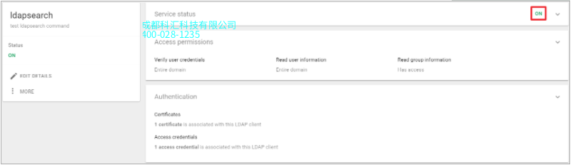 后,在配置访问权限,下载证书并生成访问凭据之后,在页面上检查设置。确保状态为开启。您已准备好继续在Synology NAS上设置LDAP连接。
