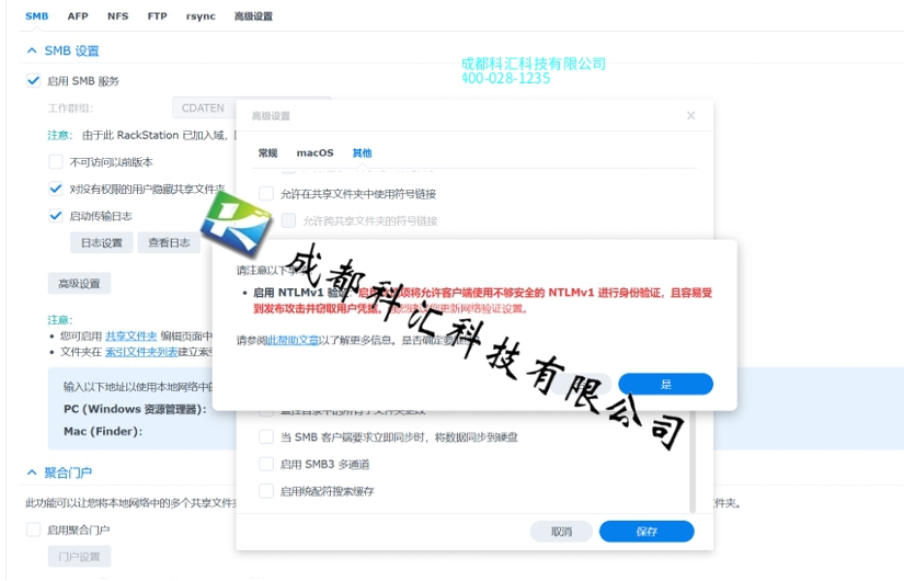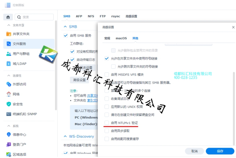 依旧没有发现问题就请管理员用户进入DSM控制面板 > 文件服务>SMB > **设置 > 其他,勾选「启用 NTLMv1 验证」,然后再试一次。
